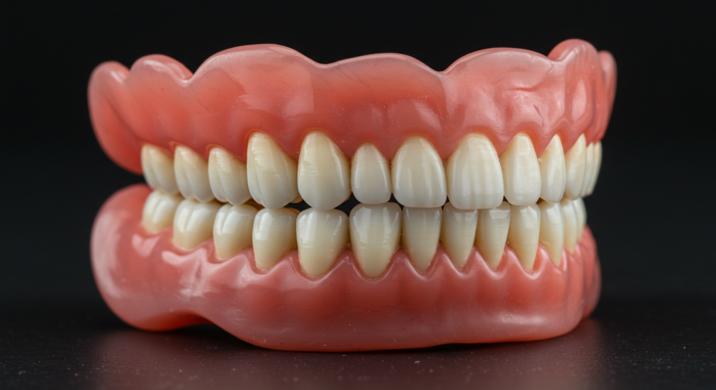 Complete dentures, also known as full dentures, are used when all natural teeth in the upper jaw, lower jaw, or both are missing. These appliances consist of a flesh-colored acrylic base that fits snugly over the gums, with artificial teeth attached to replicate a full set. They rely on suction, the shape of the jawbone ridge, and sometimes adhesive for stability.